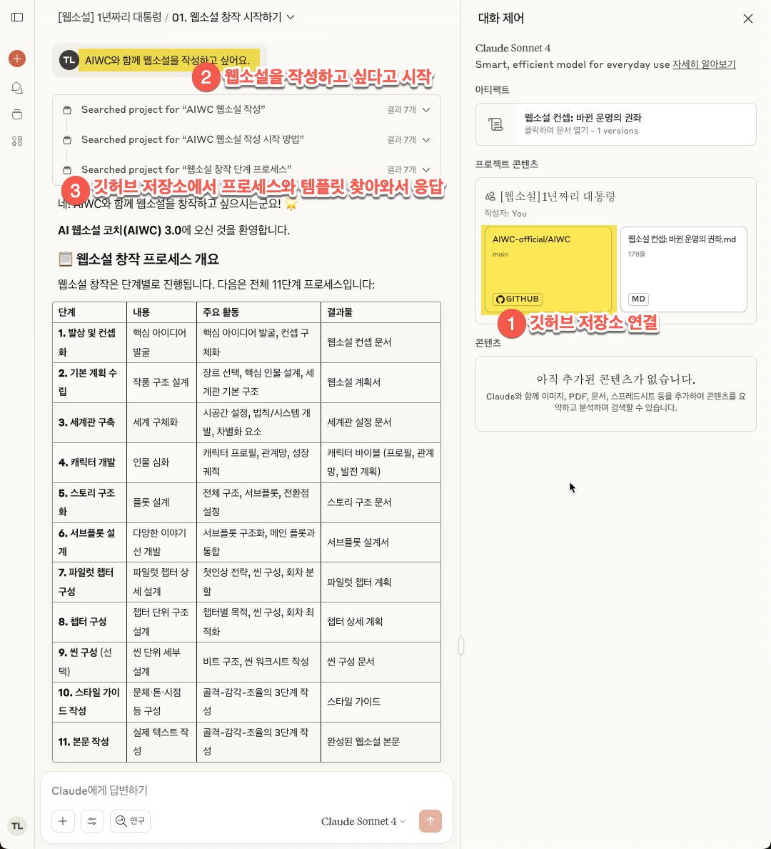 AI 서비스인 클로드(Claude) 프로젝트에서 AIWC(AI 웹소설 코치) 깃허브 저장소와 연결한 후 클로드와 대화하면, AIWC 프로세스를 기반으로 웹소설을 창작하고 템플릿에 기반하여 결과물을 만들어 줍니다.